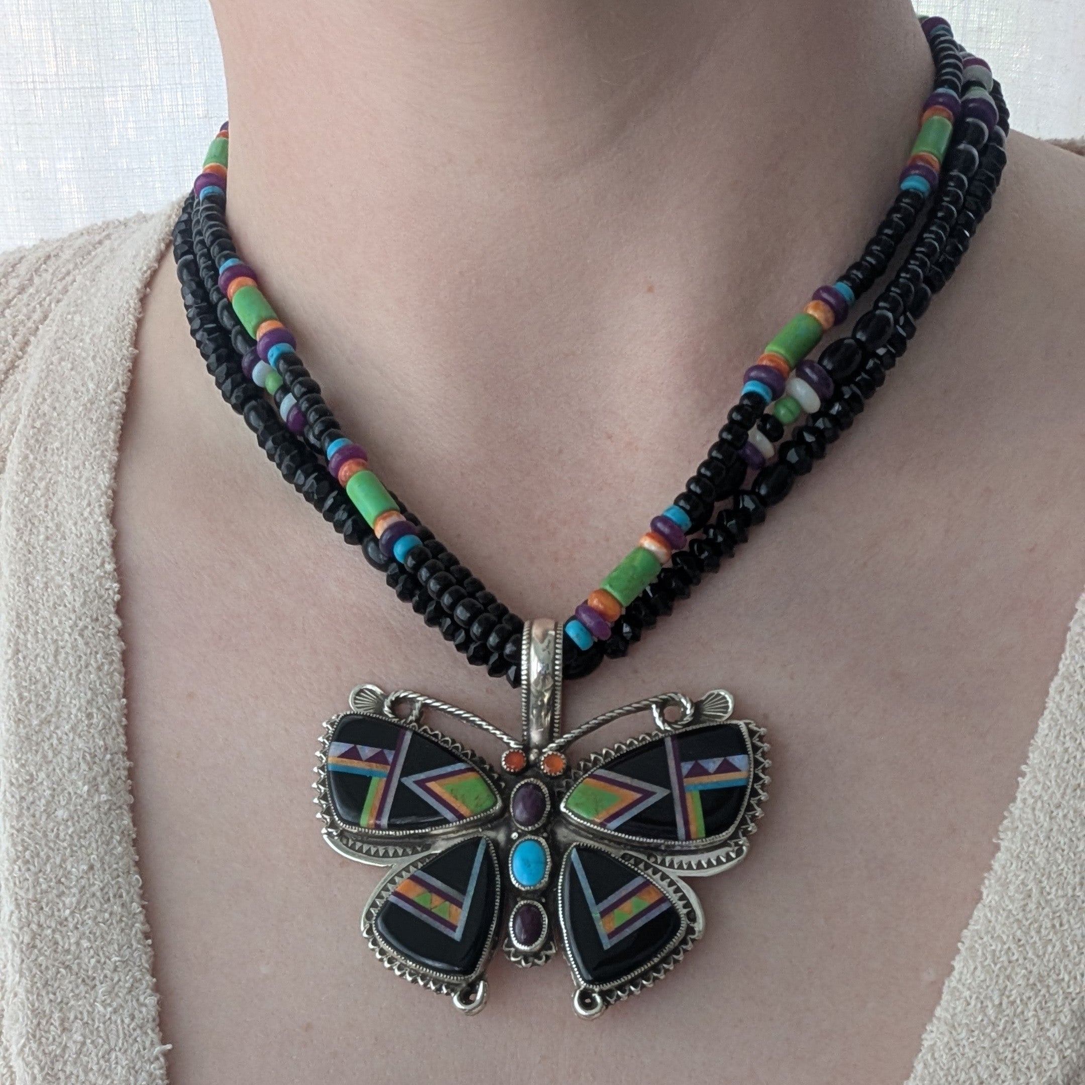 Sterling Silver Jet Butterfly Inlay Pendant with Beaded Necklace