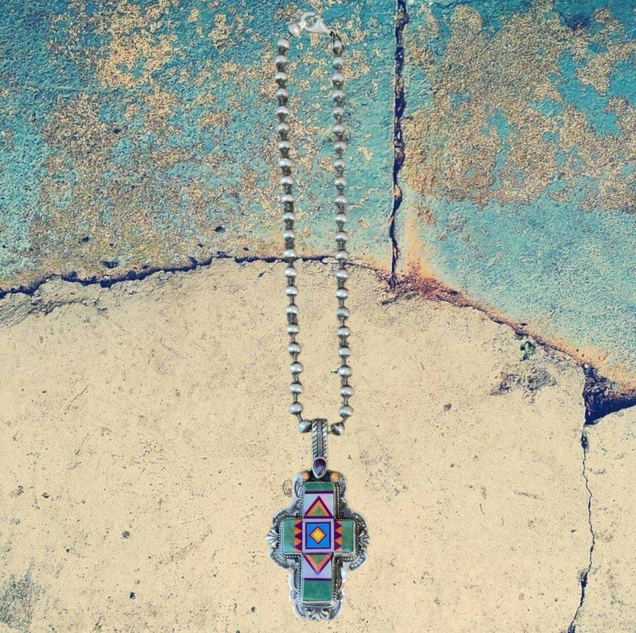 Sterling Silver Green Turquoise Fancy Cross Inlay with Bead Chain Pendant Necklace