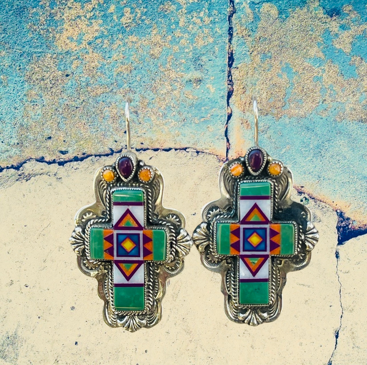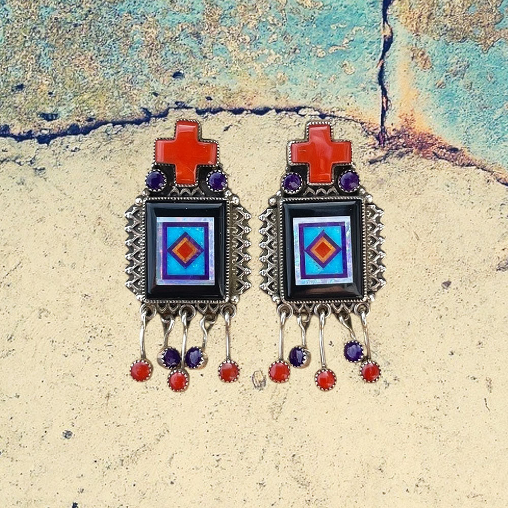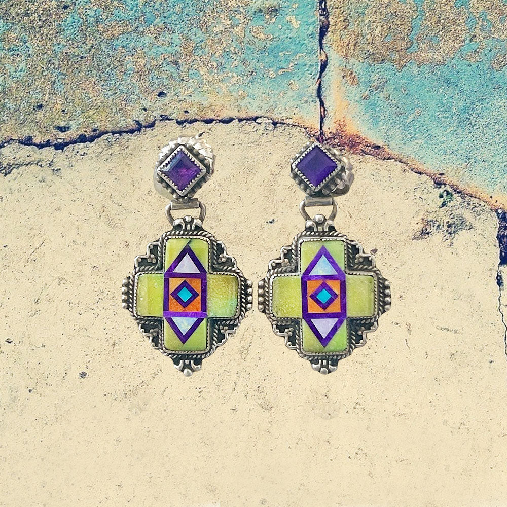 Sterling Silver Fancy Cross Mojave Turquoise Inlay with Amethyst Dangle Earrings