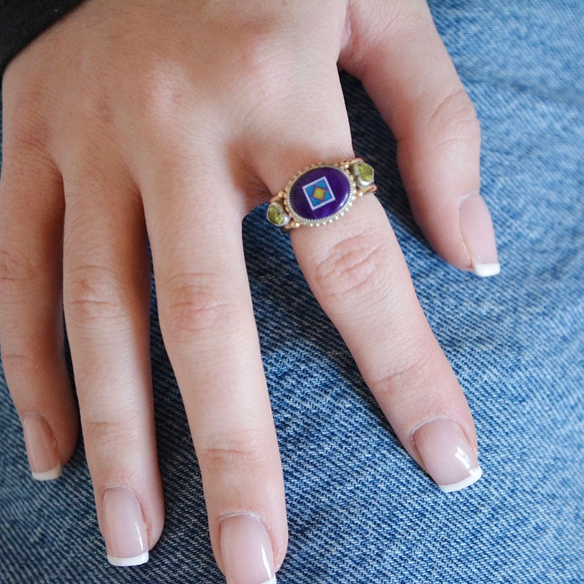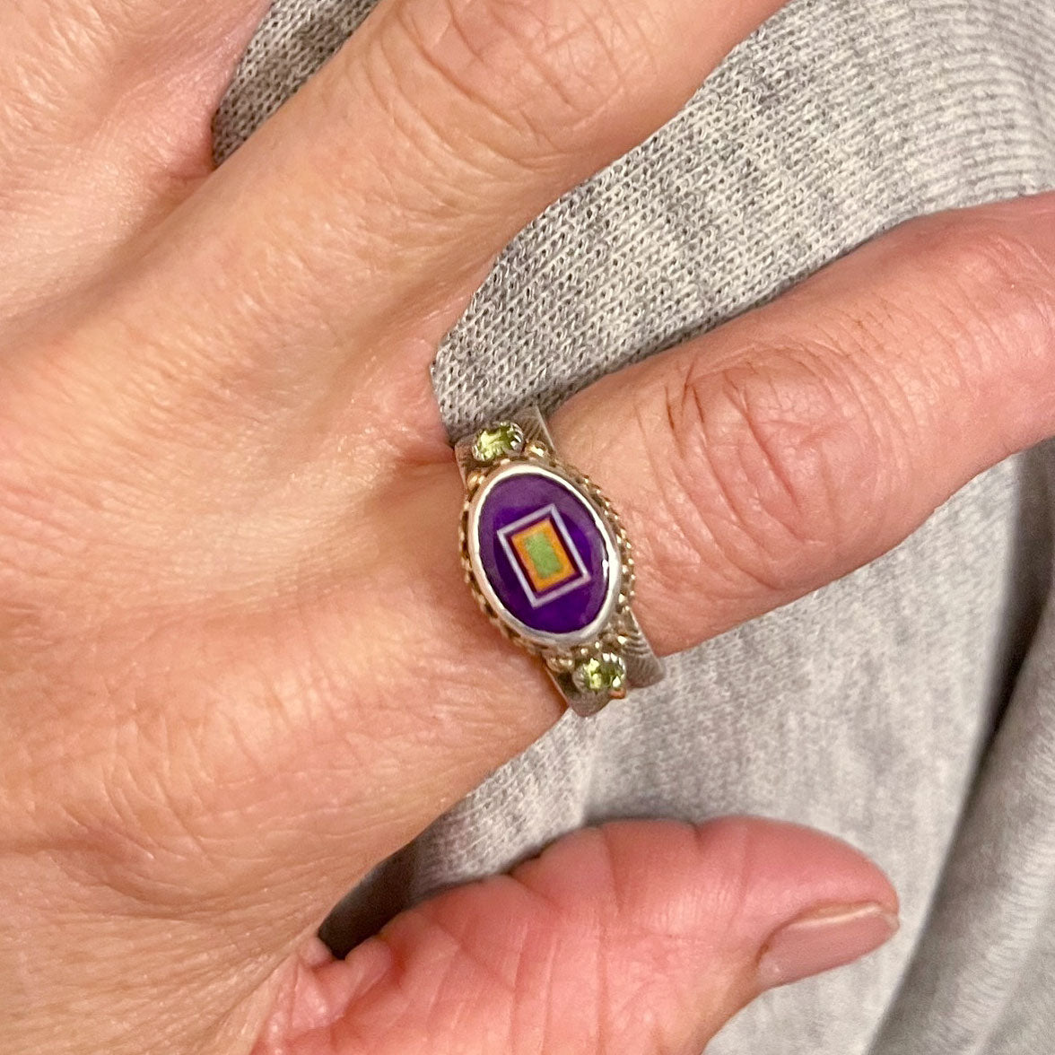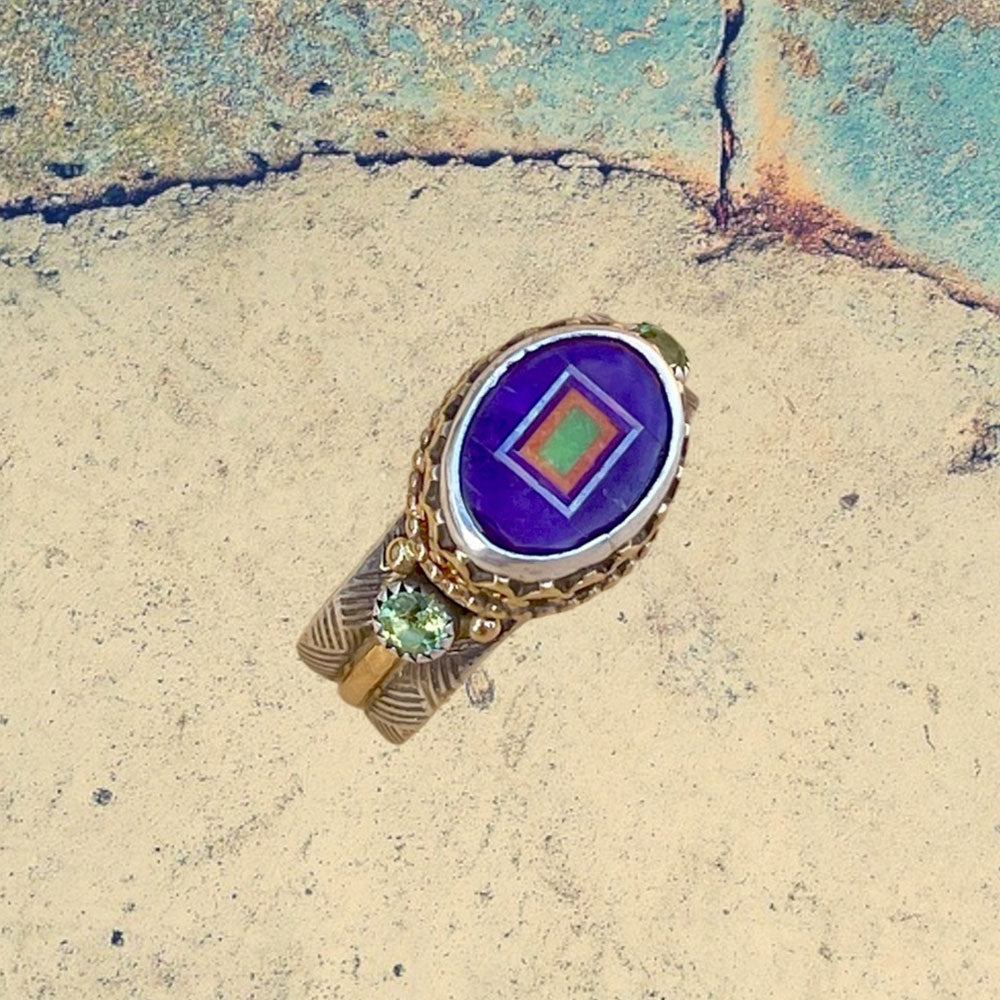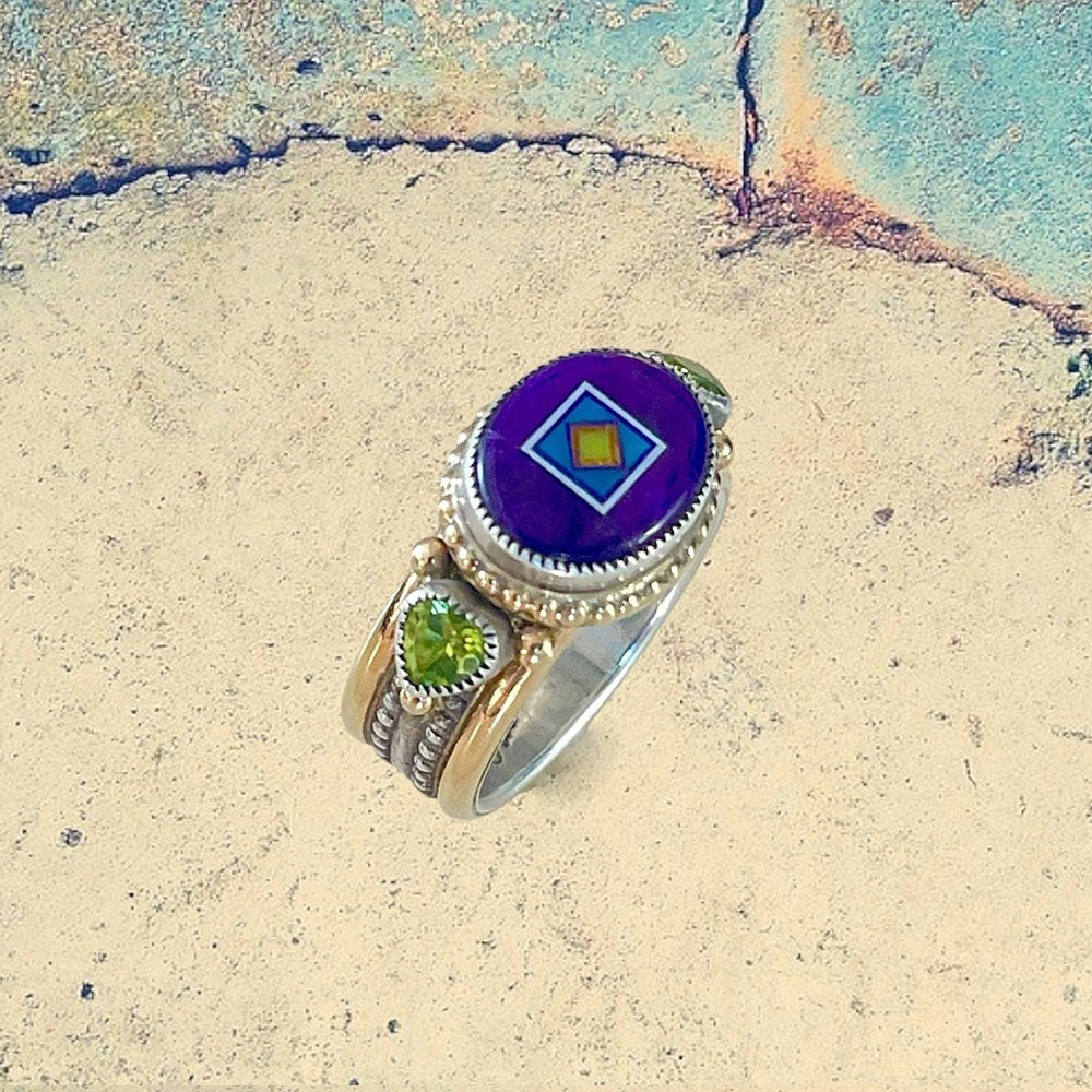 14K Yellow Gold and Sterling Silver Sugilite Oval Inlay with Peridot Ring