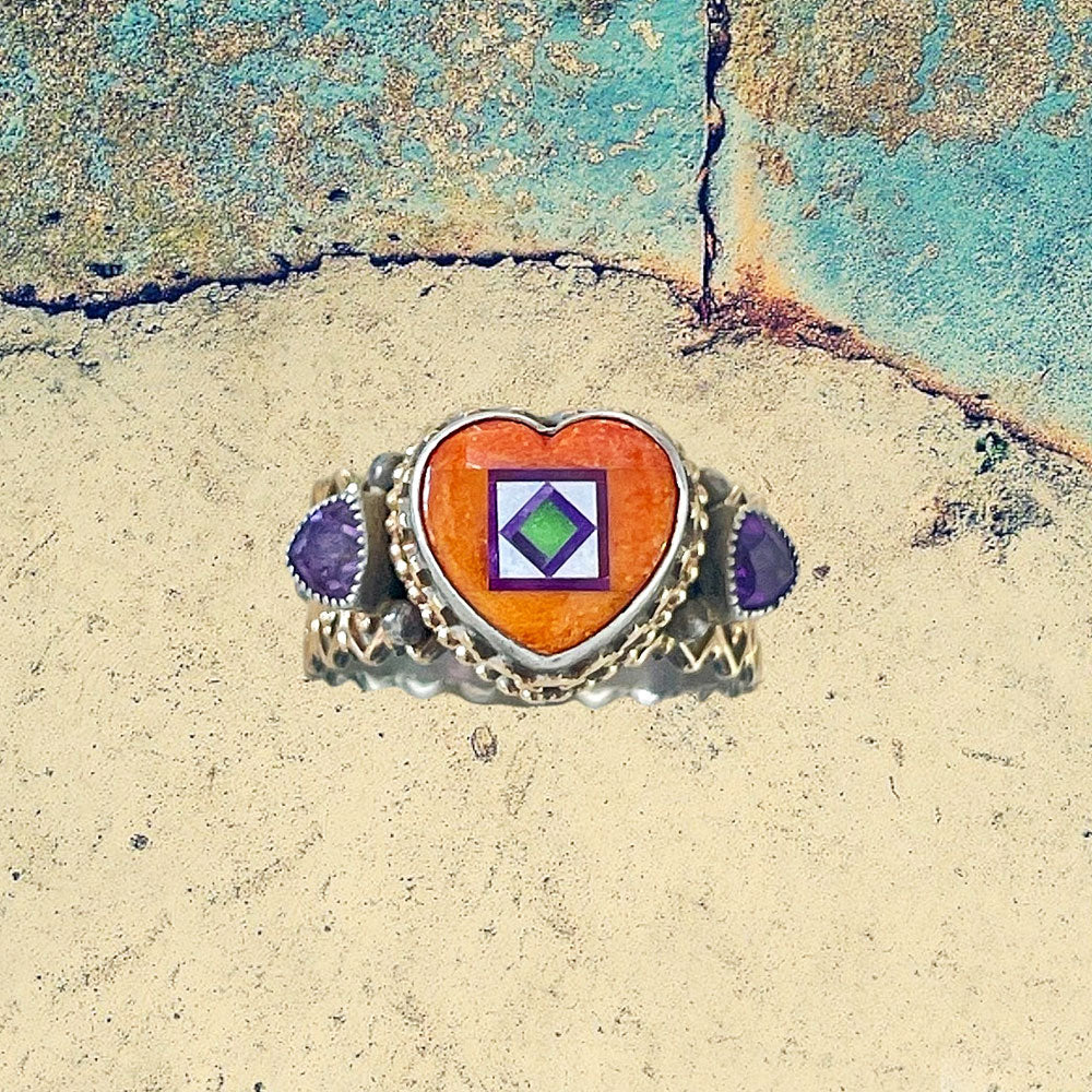 14K Yellow Gold and Sterling Silver Orange Spiney Oyster Shell Heart Inlay with Amethyst Ring