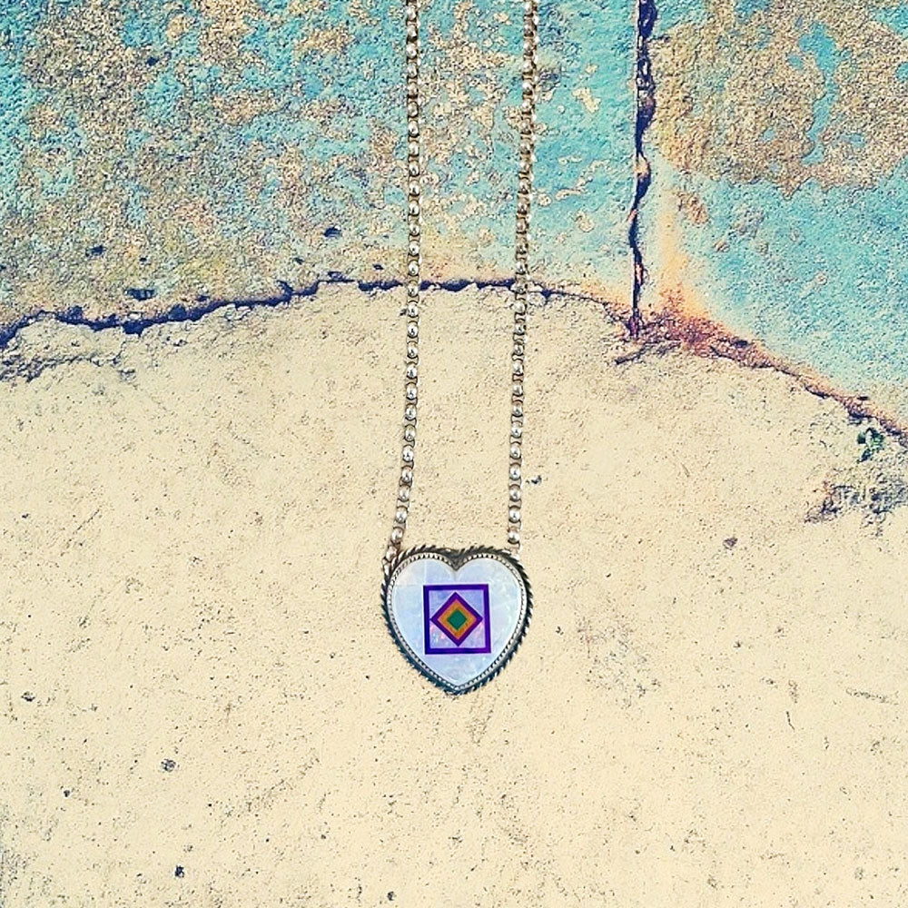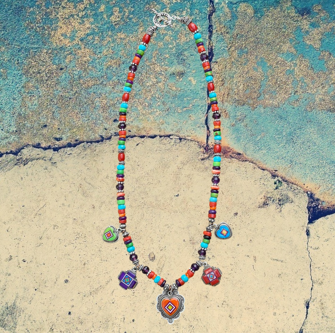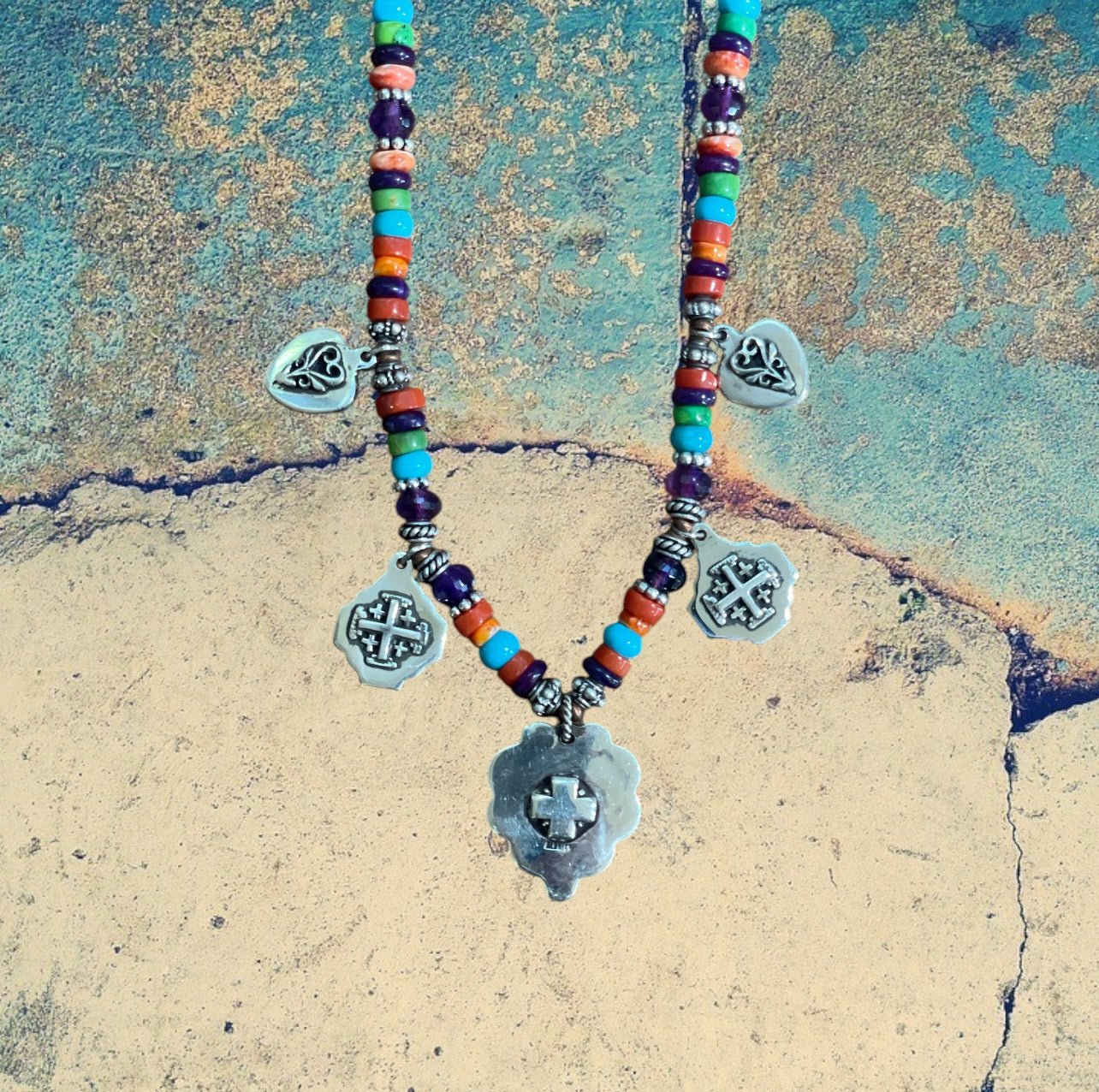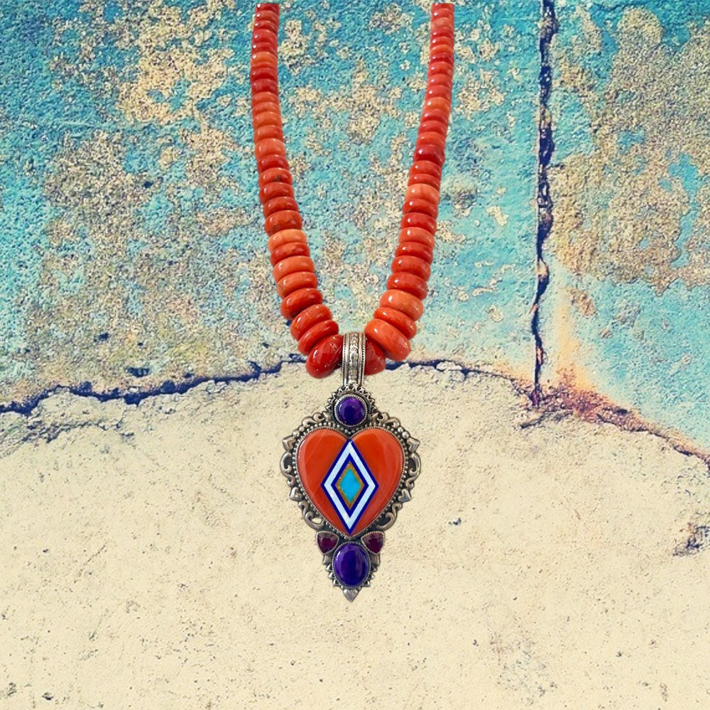 Sterling Silver Red Coral Heart Inlay with Sugilite and Rubies Beaded Necklace with Inlay Clasp