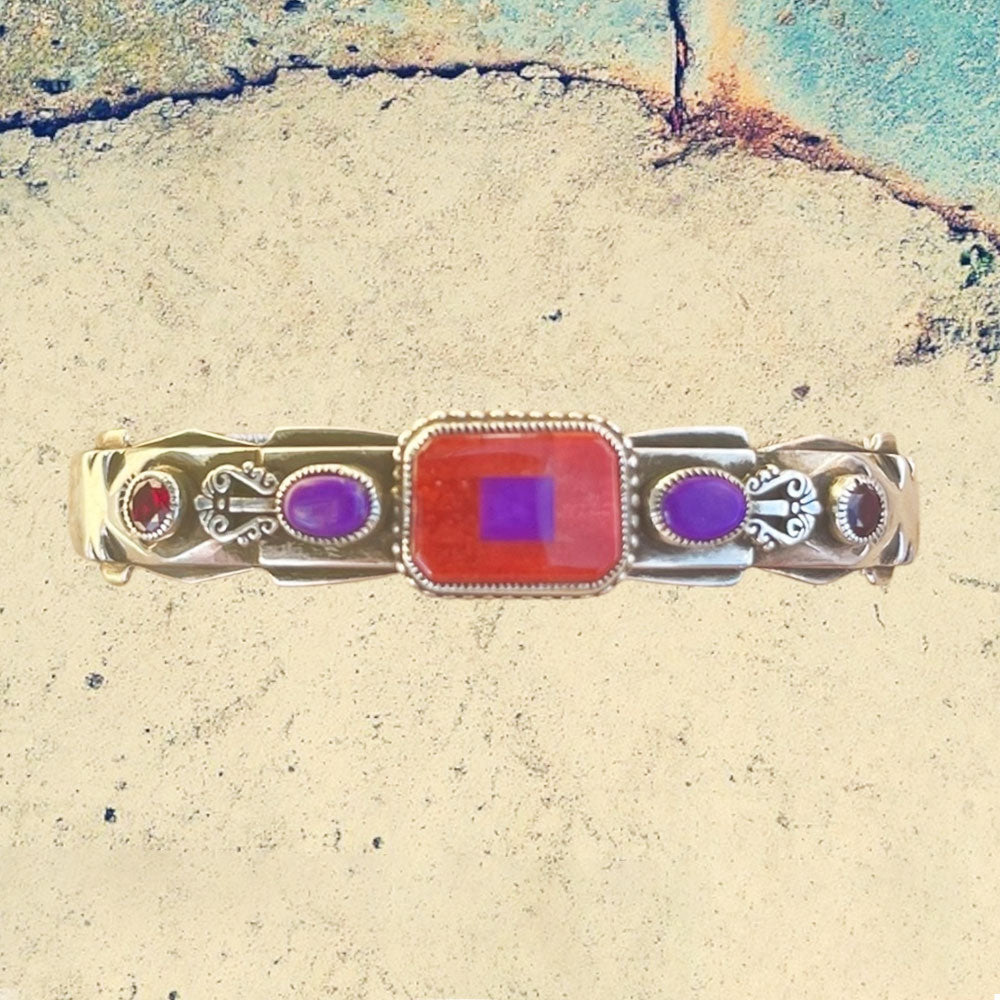 Sterling Silver Red Spiney Oyster Shell Inlay with Sugilite and Amethyst Cuff Bracelet