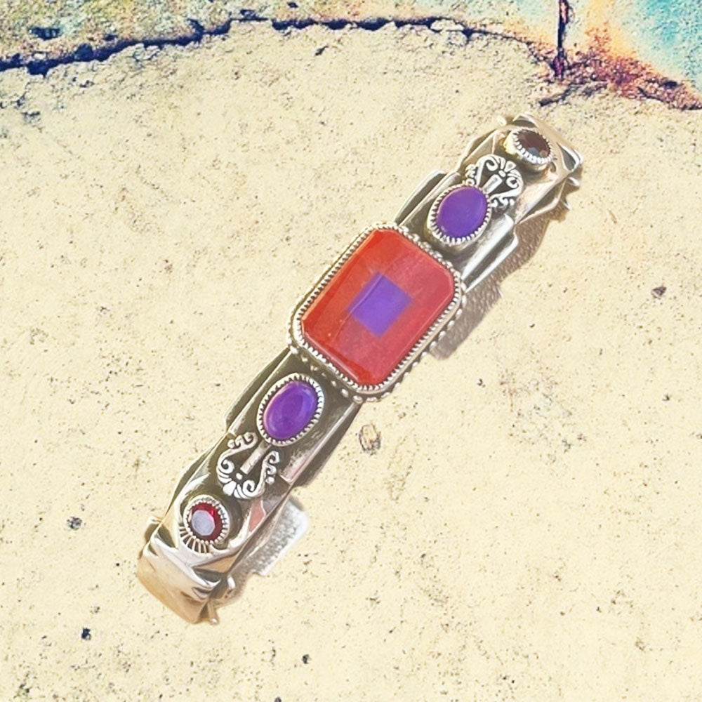 Sterling Silver Red Coral Oval Inlay with Ruby, Carnelian, Amethyst and Blue Topaz Cuff Bracelet