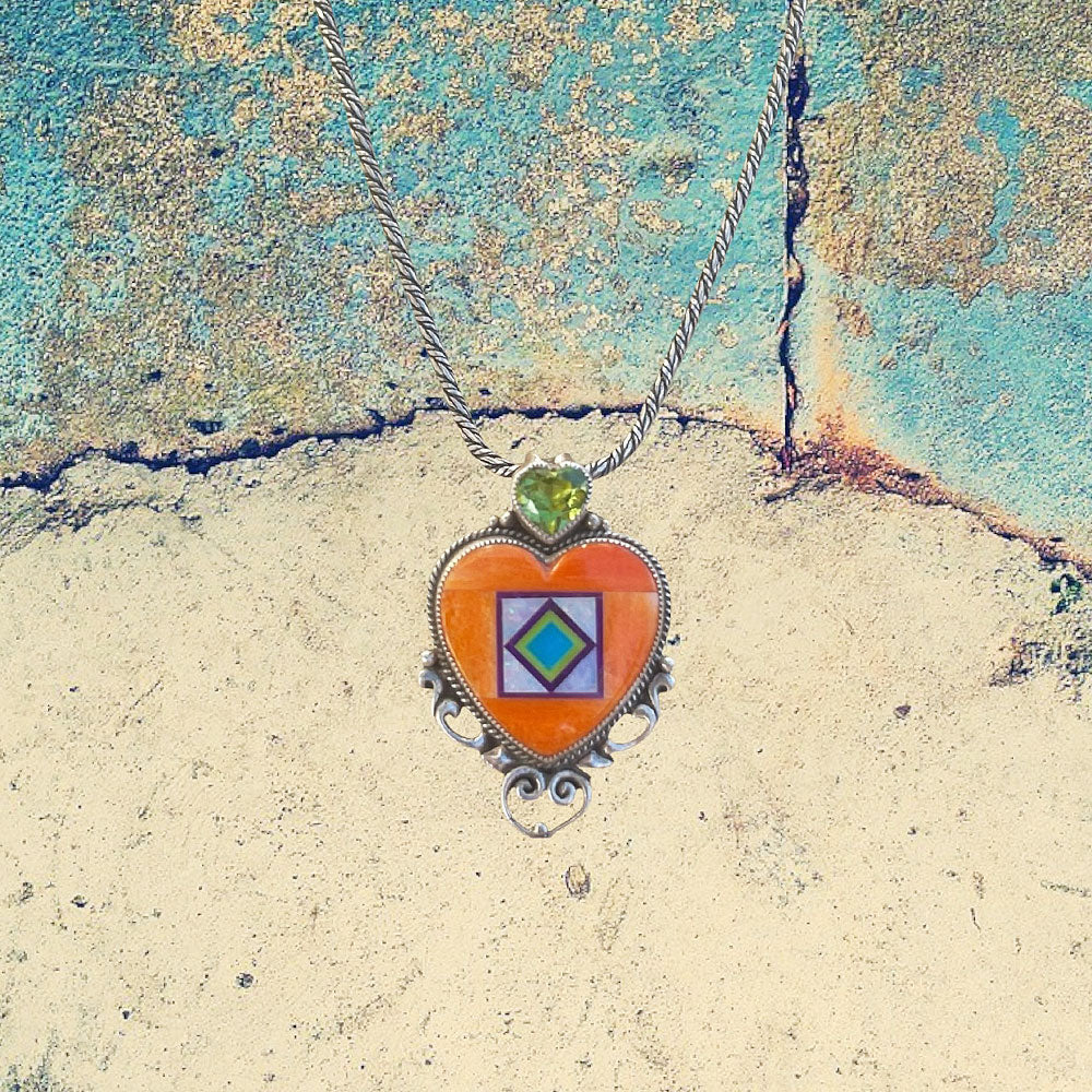 Sterling Silver Orange Spiney Oyster Shell Heart Inlay with Peridot Pendant Necklace