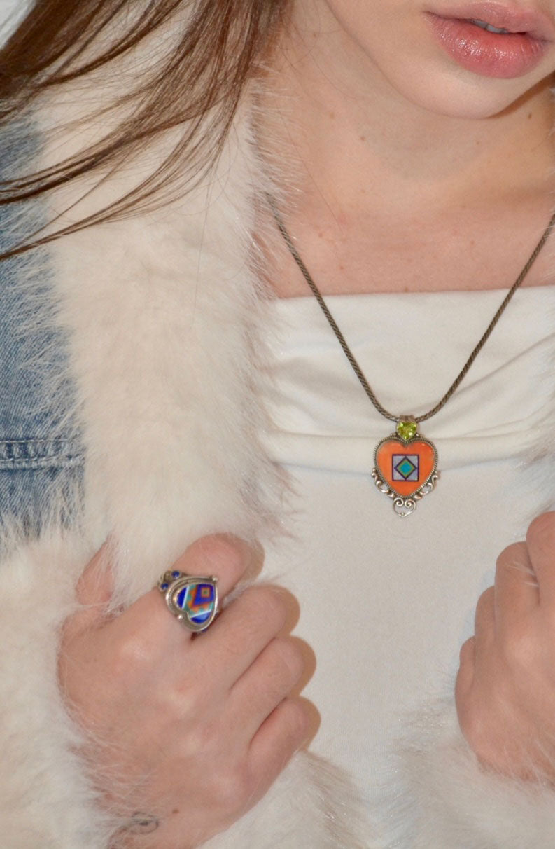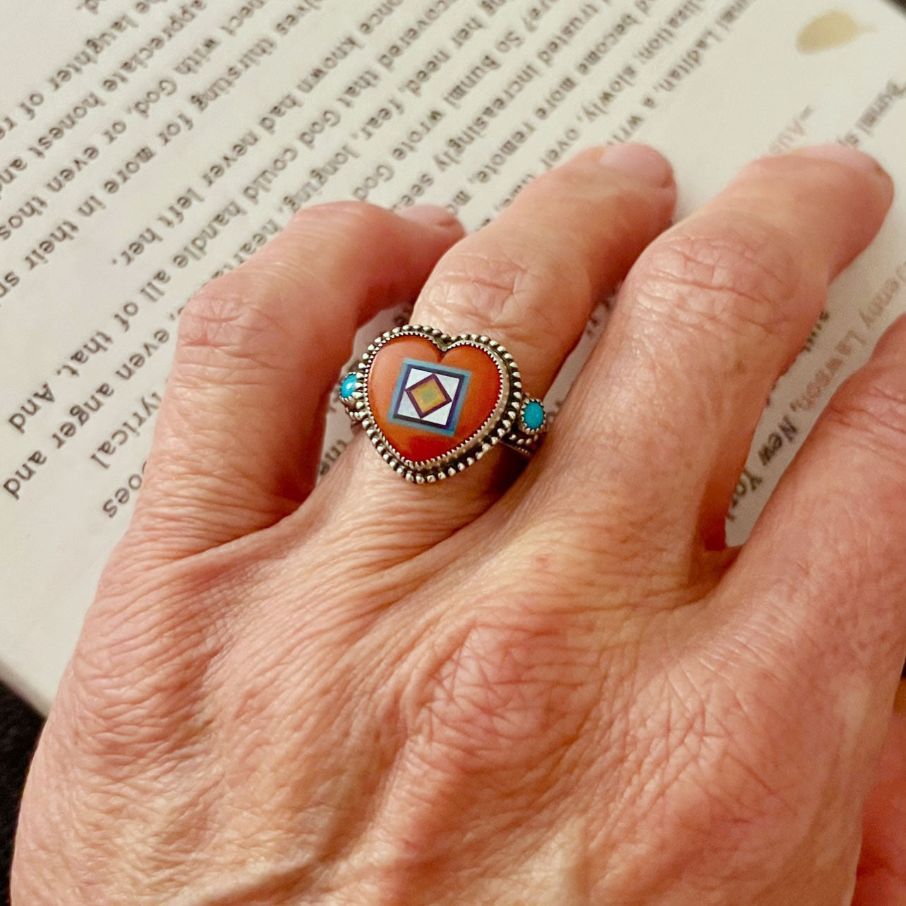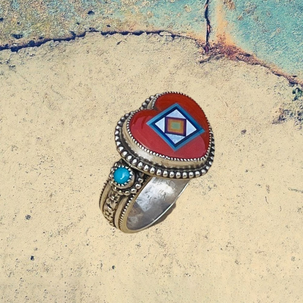 Sterling Silver Red Coral Heart Inlay with Turquoise Ring