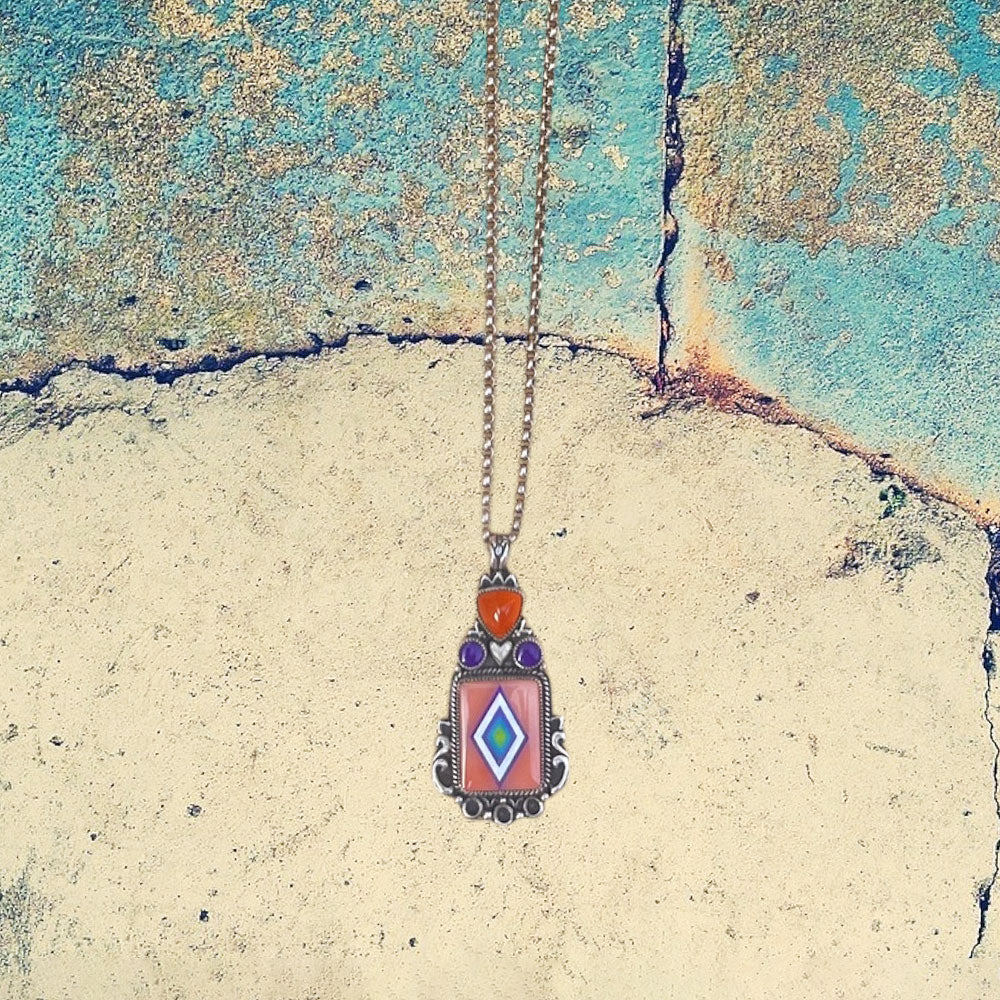 Sterling Silver Pink Coral Rectangle Inlay with Sugilite and Carnelian