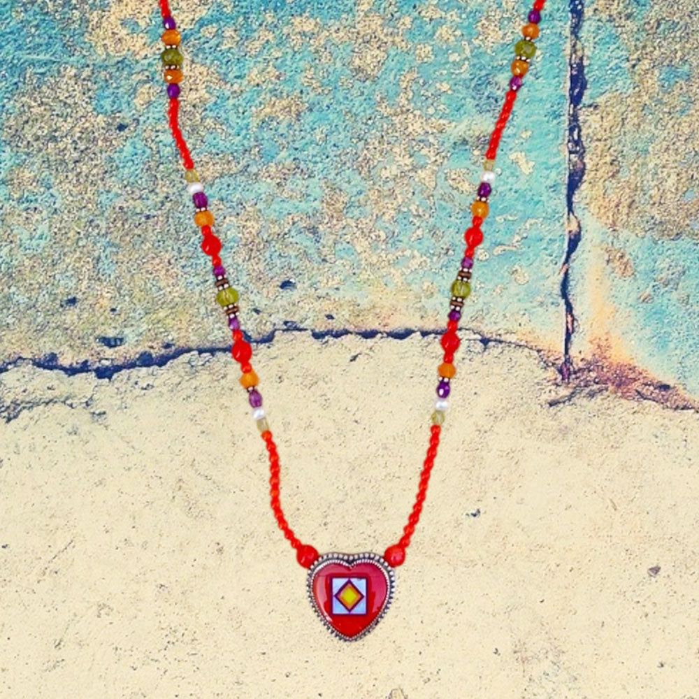 Sterling Silver Red Coral Heart Inlay Beaded Necklace