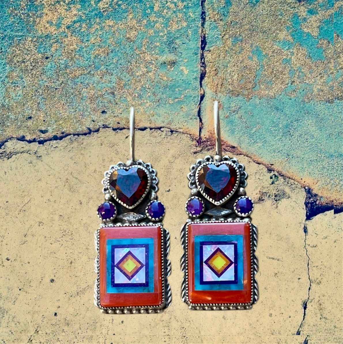 Sterling Silver Red Coral Rectangle Inlay with Coral and Sugilite Cabochons Stamped Earrings