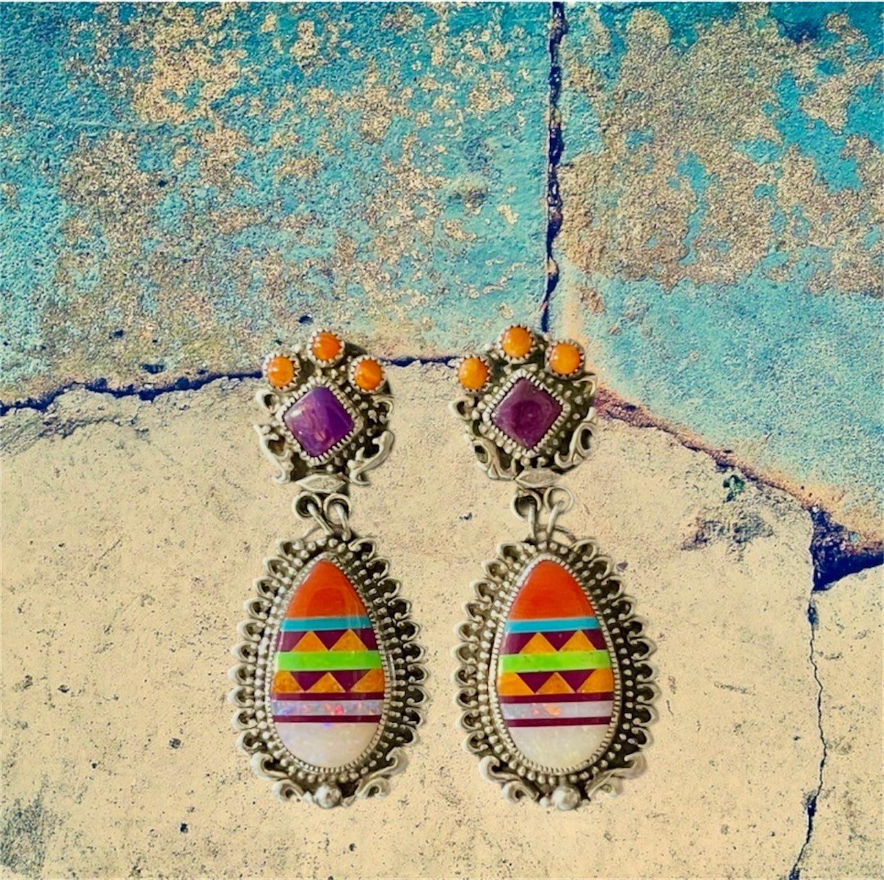 Sterling Silver Orange Spiney Oyster Shell Rectangle Inlay with Sugilite, Turquoise, Amethyst and Peridot Earrings