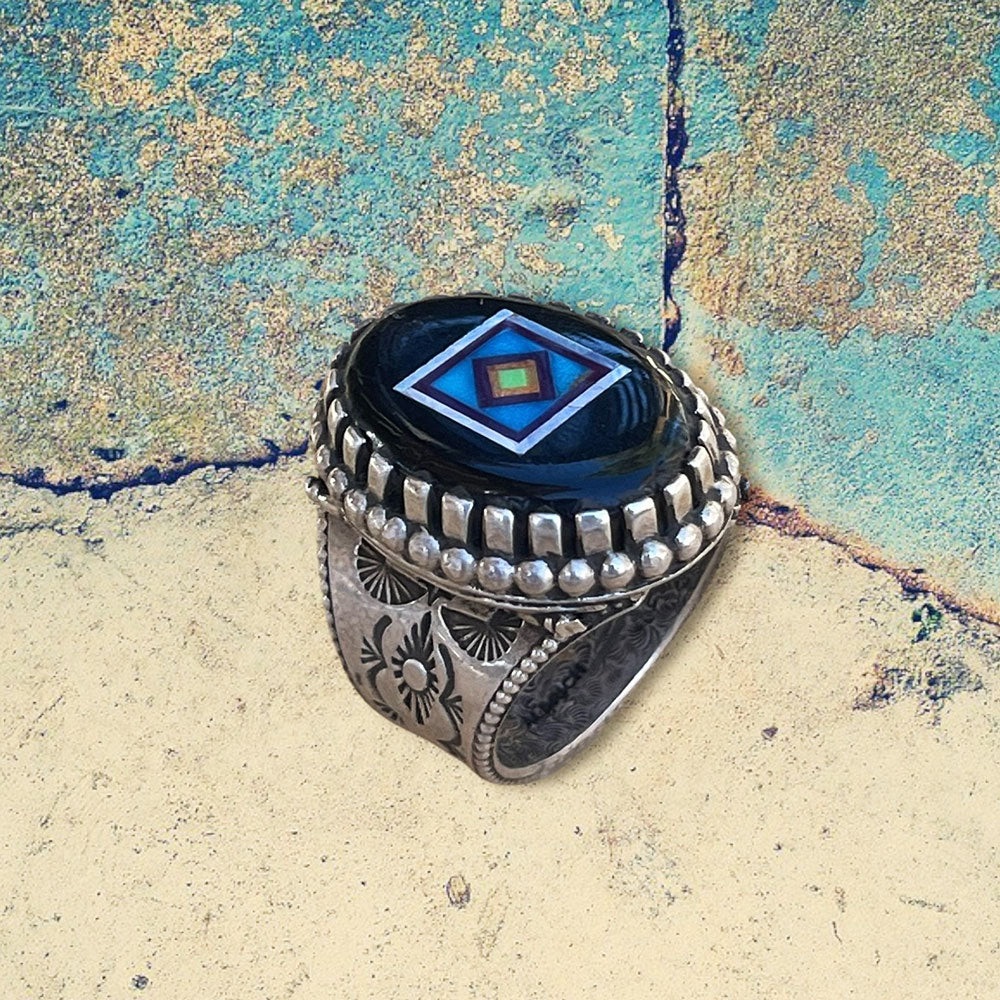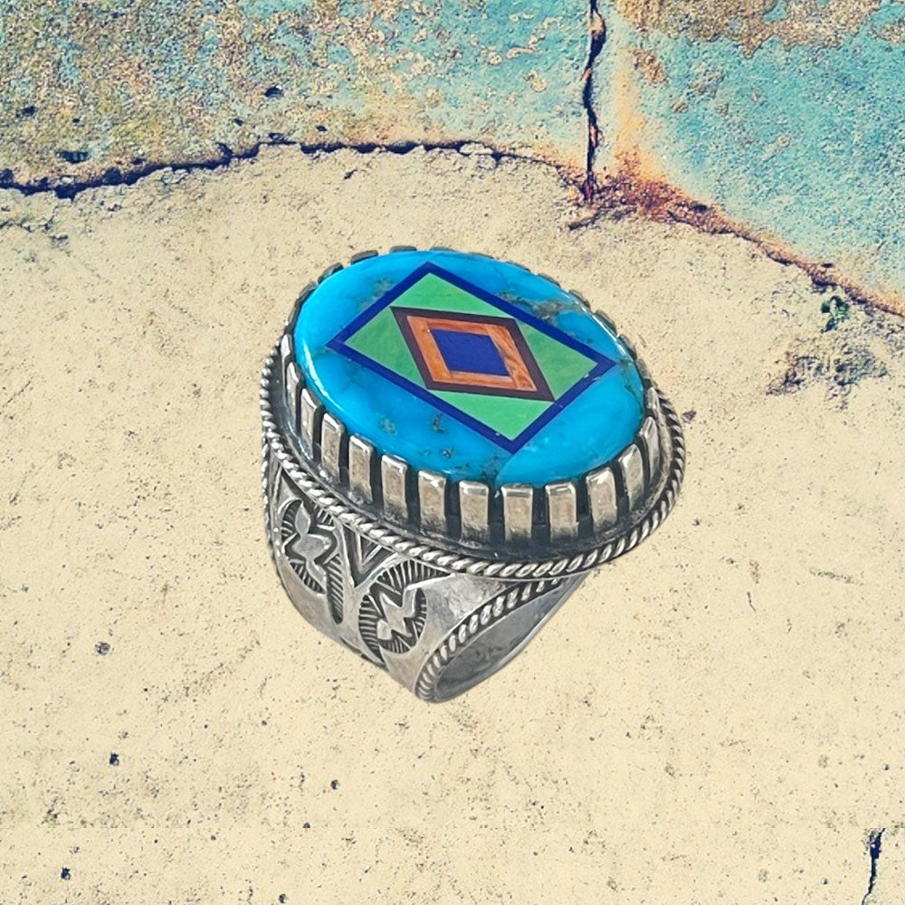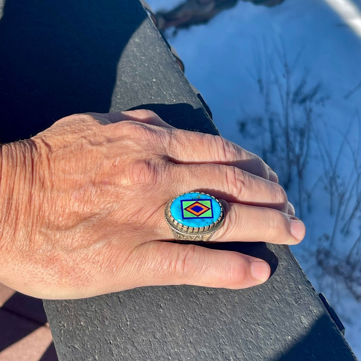 Sterling Silver Men's Large Turquoise Oval Inlay Ring